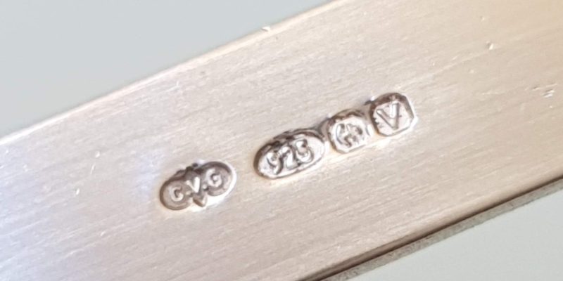 Here is one of ours (hugely magnified). CVG is our Silversmith Clare’s initials, followed by 925 to denote Sterling Silver. Next comes the tiny anchor which is the mark of the Birmingham Assay Office where our pieces get sent for stringent testing and finally the letter V which in this case means the year 2021.