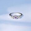 This stunning, slow crafted ring features a spectacular 5mm Amethyst framed by two white Zircons.  Not to be confused with lab created Cubic Zirconia (cz) – Zircon is a rare, natural gemstone with outstanding optical splendor that closely resembles a Diamond.  The beautiful band has been delicately hammered to reflect every facet of light as your fingers move.  A truly beautiful Trio of gems, suitable for Engagement or an extra special gift for a loved one… or why not treat yourself, you deserve it!