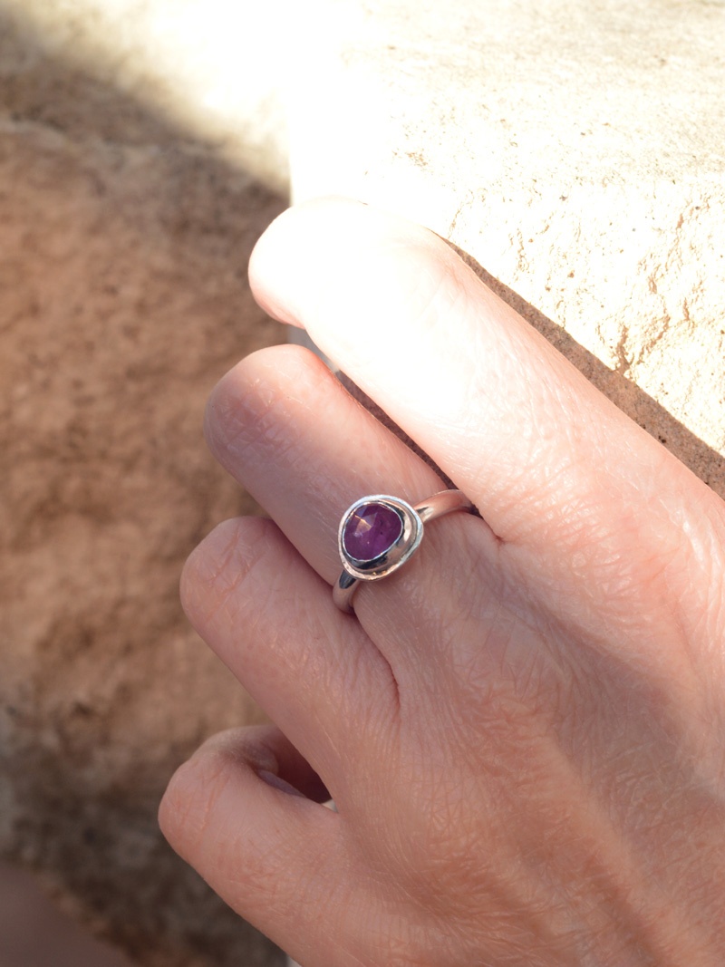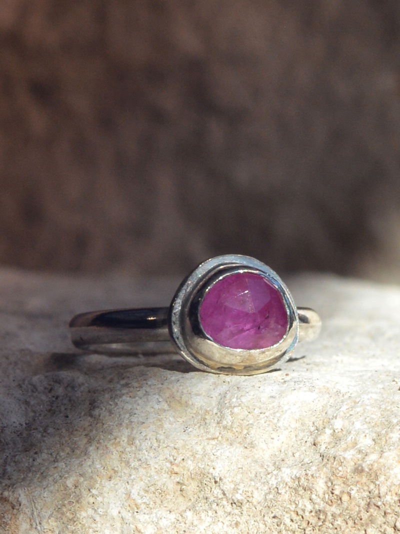 This truly stunning ring is a One of a Kind beauty. Beautifully encased in a recycled sterling silver bezel with our signature Organic Finish shank. This Pink Sapphire has been meticuloiusly hand cut just for us by our Lapidarist in a rose cut freeform shape for added uniquness. She is the only one in the entire world. Don’t forget to check out our other Gemstone Jewellery.